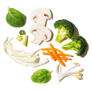 Broccoli, mushrooms, pak choi, onion, spring onion, soybean sprouts, carrot and cabbage