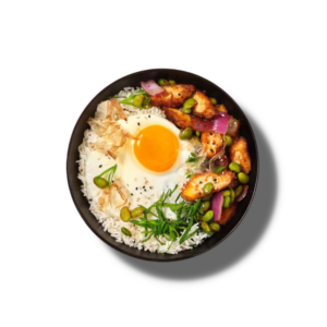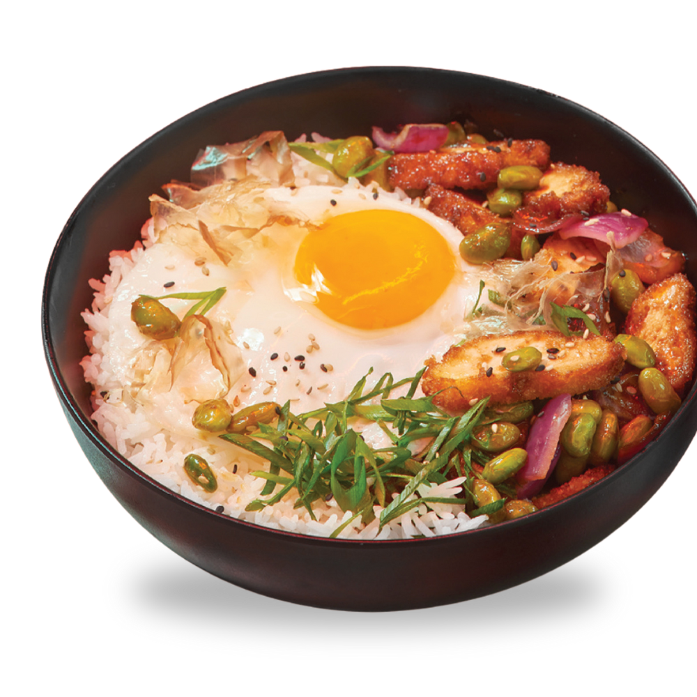 Steamed jasmine rice, choice of protein, fried egg, edamame, onions, sesame seeds and spring onions. Choose your sauce.