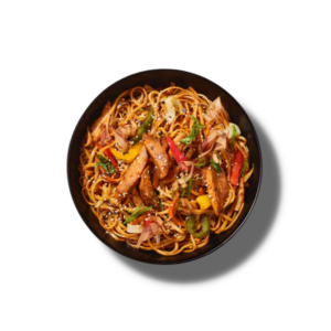 Hakka noodles, choice of protein, pepper mix, egg, Yakisoba sauce, spring onions, sesame seeds.